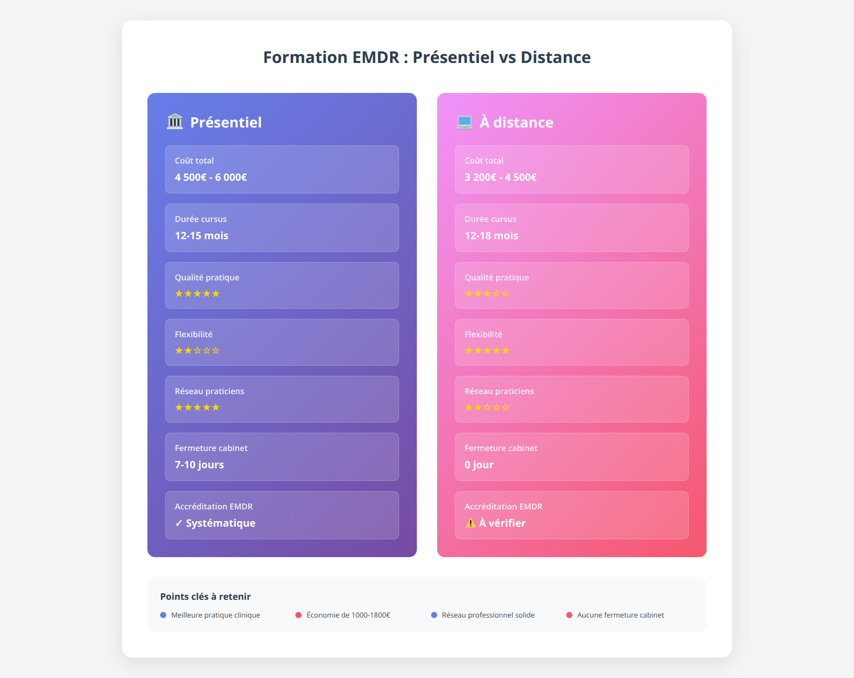 Choisissez la formation à distance si votre activité ne tolère pas d’absence. L’économie de 1 000€ à 1 800€ finance des sessions supervision supplémentaires.